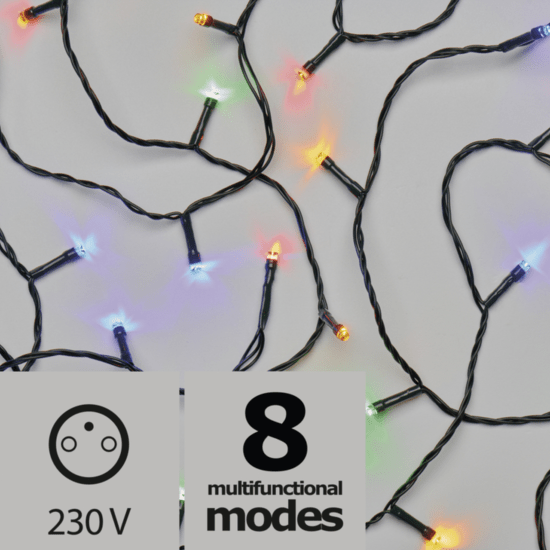 LED vánoční řetěz multicolour o délce 8m vhodný do venkovních i vnitřních prostor. Vstupní napětí AC 230V. Vhodné pro strom o výšce 1,4m.